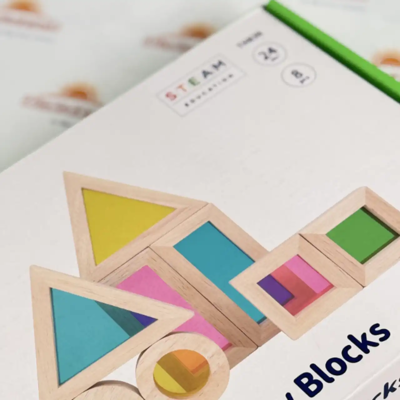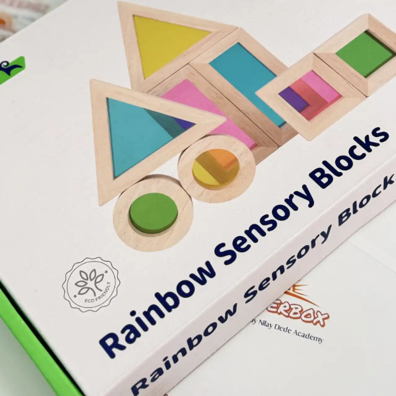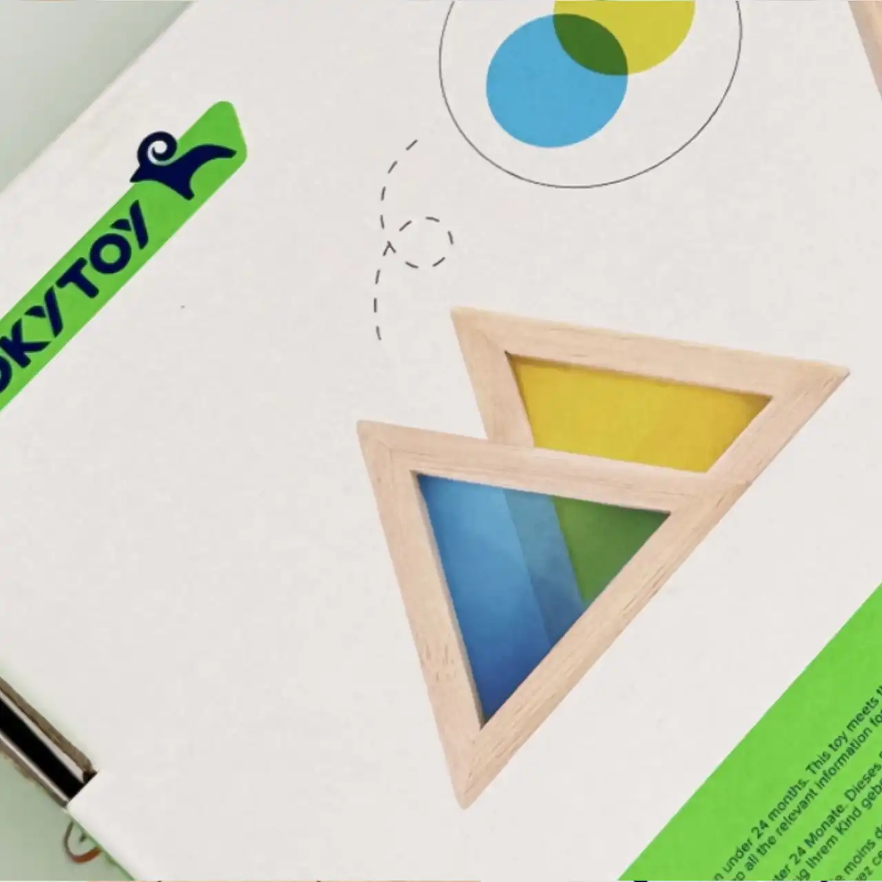 Set, farklı boyutlarda 8 farklı geometrik şekilden oluşur ve her bloğun içinde şeffaf renkli bir film bulunur. Çocuk, iki şekli birleştirerek renklerin nasıl karıştığını gözlemleyebilir; örneğin mavi ve sarının birleşerek yeşili oluşturduğunu keşfeder. Bu özel oyun, çocuğun algısal becerilerini geliştirirken temel matematiksel yetilerini de destekler.